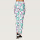 These leggings have a pattern of scattered ovals in turquoise and purple with white ovals and circles with lines inside.