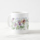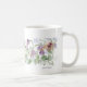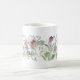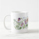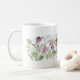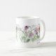 This is a very muted and subtle band of flowers around this mug. It looks like it may have been done as a watercolor or possibly a chalk drawing. The flowers look like Pansies or Johnny-Jump-Ups. The flowers colours are lavender, purple, and a soft peach.