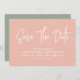 Modern calligraphy save the date in peach and sage green with a digital scannable QR code for a website or contact information on the back.