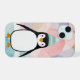 This charming illustration features a whimsical penguin centered against a backdrop of soft, overlapping semicircular hills. The palette is a gentle dreamscape of pastel pinks, lavenders, and mint greens, executed with a delicate watercolor texture that suggests a snowy, magical landscape. The penguin itself wears a cozy, patterned teal beanie, adding a touch of personality and warmth to the cool setting. Subtle gold leaf accents in the sky and on a floating celestial sphere provide a hint of fairy-tale elegance, blending minimalist character design with folk-art inspired patterns.