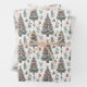 Cute wrapping paper in three different patterns of pink, white and blue Christmas trees with presents and decorations