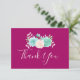A thank you card with a magenta background. A pastel colour watercolor bouquet at the top. The flowers, leaves and sprigs are pastel pink and green. Created with watercolor paint and digitised.