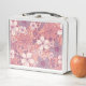 This lunch box features flowers and leaves in pastel shades of pink and purple on a pink background.