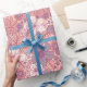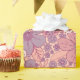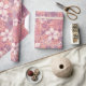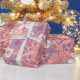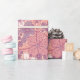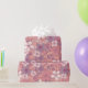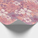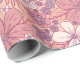 This gift wrap has flowers and leaves in pastel shades of pink and purple on a pink background.