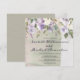 Modern and contemporary watercolor floral. A cascade of pastel purple and creamy white flowers combines with greenery, leaves and vines to create a chic arrangement of flowers. They gently drape over a modern sage green vertical watercolor wash that has the softest pink highlights. It creates a sophisticated and beautiful backdrop for your wedding details. Your names are written in a vintage handwritten script, while the remaining text is a simple serif font. This is part of a wedding suite called. Pastel Purple Floral with Watercolor Wash.