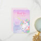 Pastel rainbow unicorn artwork with watercolor wash background and delicate cloud illustration. This whimsical fairytale layout features elegant script typography and dreamy pastel hues, perfect for a magical girl birthday party celebration.