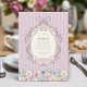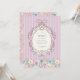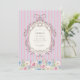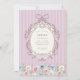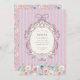 This enchanting birthday invitation features a whimsical floral wreath and elegant stripes, perfect for a young girl's celebration. The soft pink and blue striped background creates a playful yet sophisticated base, while the detailed floral border at the bottom adds a touch of natural beauty. The ornate oval frame at the top is designed to beautifully display all the essential party information, ensuring a clear and stylish announcement. It's a wonderful way to invite guests to a memorable birthday party with a touch of vintage charm.