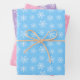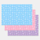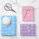 A pattern of white snowflakes on pale blue, pink and purple / mauve backgrounds.