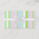 This pretty business card is perfect for any business or occupation. It features green, pink, blue, and white stripes on the front. A ribbon and bow run through the centre. A graphic of an opal sits in the centre of the bow. The back is a solid green. All text is customisable.