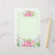 A bright and colourful watercolor inspired stationary with a pink line border. At the bottom of the page there are pastel pink orange roses and pink and purple flowers. Around the flowers there are green leaves and high grass. On the top of the paper there are more pink flowers, orange pink roses and green leaves.