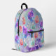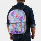 This customisable backpack is a piece of art that captures the essence of a serene and magical garden. The backdrop, painted in soft hues of lavender and sky blue, is speckled with delicate white/orange splatters, reminiscent of a starlit sky or the first snowfall. Scattered leaves, each intricately detailed with fine lines depicting the veins, float gracefully on this enchanting canvas. These leaves, painted in harmonious pastel shades of purple, pink, blue, orange and teal, are bordered by an ethereal glow of purple, blue and pink watercolors. The colours bleed softly into the background, creating a dreamy and captivating effect. The text is fully customisable.