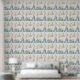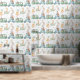The artwork is illustrated in a soft vintage watercolor style, using a calming palette of pastel greens, soft blues, warm yellows, and gentle peach tones. The result is a nursery wallpaper that feels playful, cozy, and soothing at the same time.