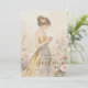 This Sweet Sixteen invitation design conveys elegance and delicacy with a romantic pastel style. The illustration shows a young woman wearing a golden and gray strapless gown, surrounded by soft flowers, with a blurred background that adds serenity and harmony. The composition creates a romantic, charming, and sophisticated atmosphere, capturing a moment of contemplation and joy with a watercolor effect that highlights softness and warmth.