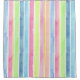 A pretty shower curtain decorated with a wide stripe pattern made with hand painted watercolor washes in pastel shades of pink, peach, chartreuse, green, light and dark blue with yellow and white stripe accents.