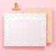 This pretty weekly planner features a floral watercolor design around the border with whimsical floating wildflowers in pretty shades of pastel pink, purple, blue, peach, lilac, and yellow. This notepad includes an undated weekly overview section in light pink that starts on Monday. This item can also be personalized with the name of the recipient, making it a great gift for her.