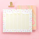 This pretty weekly planner features a floral watercolor design around the border with whimsical floating wildflowers in pretty shades of pastel pink, purple, blue, peach, lilac, and yellow. This notepad includes an undated weekly overview section in butter yellow that starts on Monday. This item can also be personalized with the name of the recipient, making it a great gift for her.