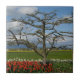 Tulips bloom underneath a fruit tree ready to blossom with the Cascade foothills in the background, white puffy clouds, and a field of yellow daffodils in complete flower. Photographed in the Skagit Valley during the annual tulip festival in Mount Vernon, Washington.
