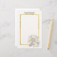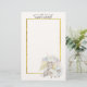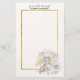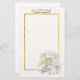 Stationery paper personalised with a name. A drawing of a sweet angel with yellow wings holding a shepherds crook. Sitting with white fluffy lambs. Watching over his flock. Soft watercolor splotches around the image. Set on an eggshell white background. A faux gold foil border around the edges. Goil foil look is just an image, not actual foil.