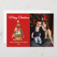 Elegant holiday photo card featuring a festive patchwork Christmas tree adorned with glass ornaments and surrounded by wrapped presents. Personalise the card by adding a custom greeting, your family name, the year, and a photo. The Christmas tree holiday card reverses to a solid red background