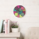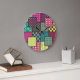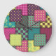 Stitched patterns create a lively patchwork background. Delightfully unique and charming decor.