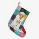 The cute snowman on this customizable shabby chic patchwork  christmas stocking is looking very smart in his stripy scarf and his black hat. The happy snowman has a  smile on his face as he looks down to his stripy Christmas stocking that he’s carefully hung on a tree branch that’s sticking out from the thick carpet of snow, he’s smiling because he’s looking forward to santa filling his stocking. This great Christmas stocking will look very cute hanging by the fireside during the christmas season. The text can be customized and you can personalize this patchwork Christmas stocking with your own words. The original snowman illustration is painted in watercolor. On this stocking the snowman is placed against a colorful fabric patchwork background, original patchwork gives the christmas stocking a vintage effect.