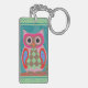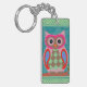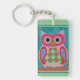 Multi-coloured, cute polka dot patchwork owl stood on a flowering tree branch with an ornate blue background and green polka dot borders.