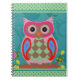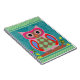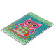 Multi-coloured, cute polka dot patchwork owl stood on a flowering tree branch with an ornate blue background and green polka dot borders.