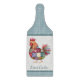 A cute little chicken cutting board that is personalised with your name. Hen is created in a colourful patchwork patterned design with a tiny polka dot background in blue.