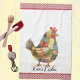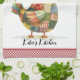 A cute chicken themed kitchen towel with a colourful patchwork hen accented with a red gingham style checked border. Personalise it with your name or other text caption. See other kitchen decor items in this same design collection.