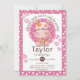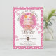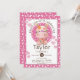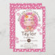 Cute patchwork hippo birthday invitations with white on pink polka dots and pink-striped hearts.