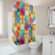 This shower curtain has a Bauhaus design of squares with odd shapes inside, repeated across the design.