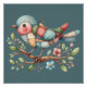 A delightful patchwork songbird perches gracefully on a blooming branch, its feathers crafted from an array of whimsical fabric prints in soft, vintage-inspired colours. The design blends folk art charm with cottagecore warmth, bringing a hand-stitched feel to your space. Detailed florals and delicate stitching accents add depth and texture, while the muted teal background enhances the bird’s vibrant patchwork patterns. Perfect for nature lovers, quilting enthusiasts, or anyone who appreciates rustic, heartwarming artistry. AI generated artwork.