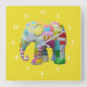 A large wallclock with an illustration of a toy patchwork elephant against a customisable bright yellow colored background. This cute child's toy would make a perfect clock for a baby room or kids playroom or kids bedroom.