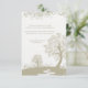 A muted scene featuring a garden with trees and a winding path to the distance. The top is bordered with a coordinating abstract trim. The background has fine horizontal pin-stripes in light grey. The card is easy to customise with your wording, font, font colour and choice of six paper types.