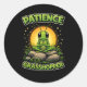 A serene cartoon grasshopper meditates on a rock beneath a glowing sunset, symbolizing mindfulness, patience, and inner peace.