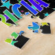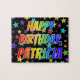 This exciting and lively birthday-themed jigsaw puzzle design features the message "HAPPY BIRTHDAY, PATRICIA" with the characters having a colourful rainbow spectrum inspired gradient pattern, along with a fun field of stars background pattern. A vibrant puzzle like this might be a fun way to acknowledge the birthday of somebody named Patricia. [~Z0000468]
