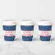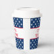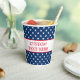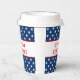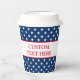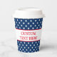 Patriot custom paper cups with American star flag pattern. Disposable party supplies with navy blue or custom colour. Double sided print with personalised text. Elegant design for Birthday, wedding, bridal shower, engagement, anniversary, baby shower, BBQ, office party, 4th of July and more. Modern typography. Great for coffee and other drinks.