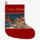 Christmas stocking with Patriotic Santa Claus in his sleigh filled with presents and American flag flying through the night. Front side printed only with red panel on back.