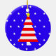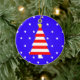 This Patriotic American Christmas ornament features a blue background with white stars and a red and white stripe Christmas tree. A great way to show your Patriotic American spirit on the Christmas tree! Copyright Ornaments by Henis