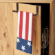 This decorative kitchen towel features a patriotic American flag design. Red and white stripes run across the towel, with navy blue banners on either end, with white stars that resemble the flag of the United States.