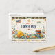 This warm and inviting Labor Day design celebrates the heart of everyday work with a friendly, vintage-inspired aesthetic. Set on a softly textured cream background, the message “Happy Labor Day” is surrounded by cheerful patriotic details, including an American flag, stars, and sunburst accents. At the center, a golden hard hat and a steaming backyard grill rest among abundant florals, symbolizing both dedication to work and the simple joys of well-earned leisure.
