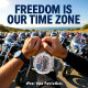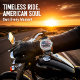 This watch face features a black bagger-style motorcycle, centred against a dynamic American flag backdrop that radiates outwards. A stylised sun is setting on the horizon behind distant mountains. The design combines patriotism with a love for motorcycling, clearly displaying white watch hands and numbers for time-telling.
