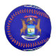 Crafted with precision and attention to detail, this baseball ball showcases the vibrant colours and symbolism of the Michigan state flag. The design prominently displays a dark blue field with the state coat of arms centred. The coat of arms features a shield with a blue background depicting a man standing on a peninsula, a rising sun, and a moose and elk on either side. Above the shield, an eagle holds a banner with the state motto: "E Pluribus Unum," and below, another banner with "Tuebor" and "Si Quaeris Peninsulam Amoenam Circumspice."