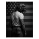 This striking black and white artwork features a muscular figure with the head of a noble Boxer dog, standing proudly against a backdrop of the American flag. The powerful imagery evokes themes of strength, loyalty, and American spirit. Perfect for dog lovers, veterans, patriots, or anyone who appreciates unique and thought-provoking art with a classic, timeless aesthetic.