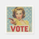 A retro-styled poster featuring a glamourous woman with blonde hair and bold red lipstick, reminiscent of 1950s pin-up art. She is pointing directly at the viewer in a pose similar to the iconic "Uncle Sam Wants You" recruitment posters. Behind her is a starry blue background, and the word "VOTE" is displayed prominently in large, bold red letters at the bottom. The overall design evokes a sense of patriotic urgency, encouraging civic participation.