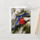 Show your patriotic spirit! A red Christmas ornament with a blue and white ribbon hangs on a snowy pine tree. Totally customisable for you to personalise as you please!