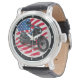 This watch face prominently features a dark-coloured cruiser motorcycle against a vibrant, waving American flag background. The motorcycle has subtle blue accents, matching the flag's colours. The design captures a sense of freedom and patriotism, with clear white watch hands and numbers for easy time reading.