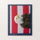 A wonderful image of a bald eagle posing in front of an American Flag.