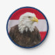 A wonderful image of a bald eagle posing in front of an American Flag.