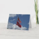 Two patriotic flags atop a flag pole blowing in the breeze against a blue sky with white clouds on a folded note card